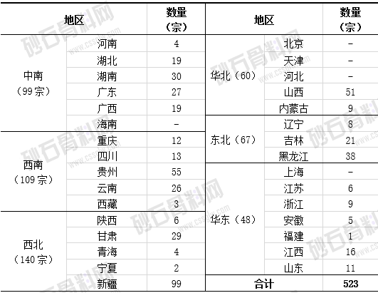 ①2023年上半年,全国共成功出让砂石类采矿权523宗,较2022年同期上涨13.2%。矿权出让主要集中在西北、西南及中南等区域,新疆出让矿权数量占各省份首位。