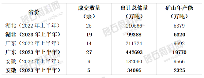湖北、安徽及广东等长江、珠江流域的砂石市场一直以来备受关注,为此特选取上述三个省份近两年上半年的采矿权信息进行简要分析。